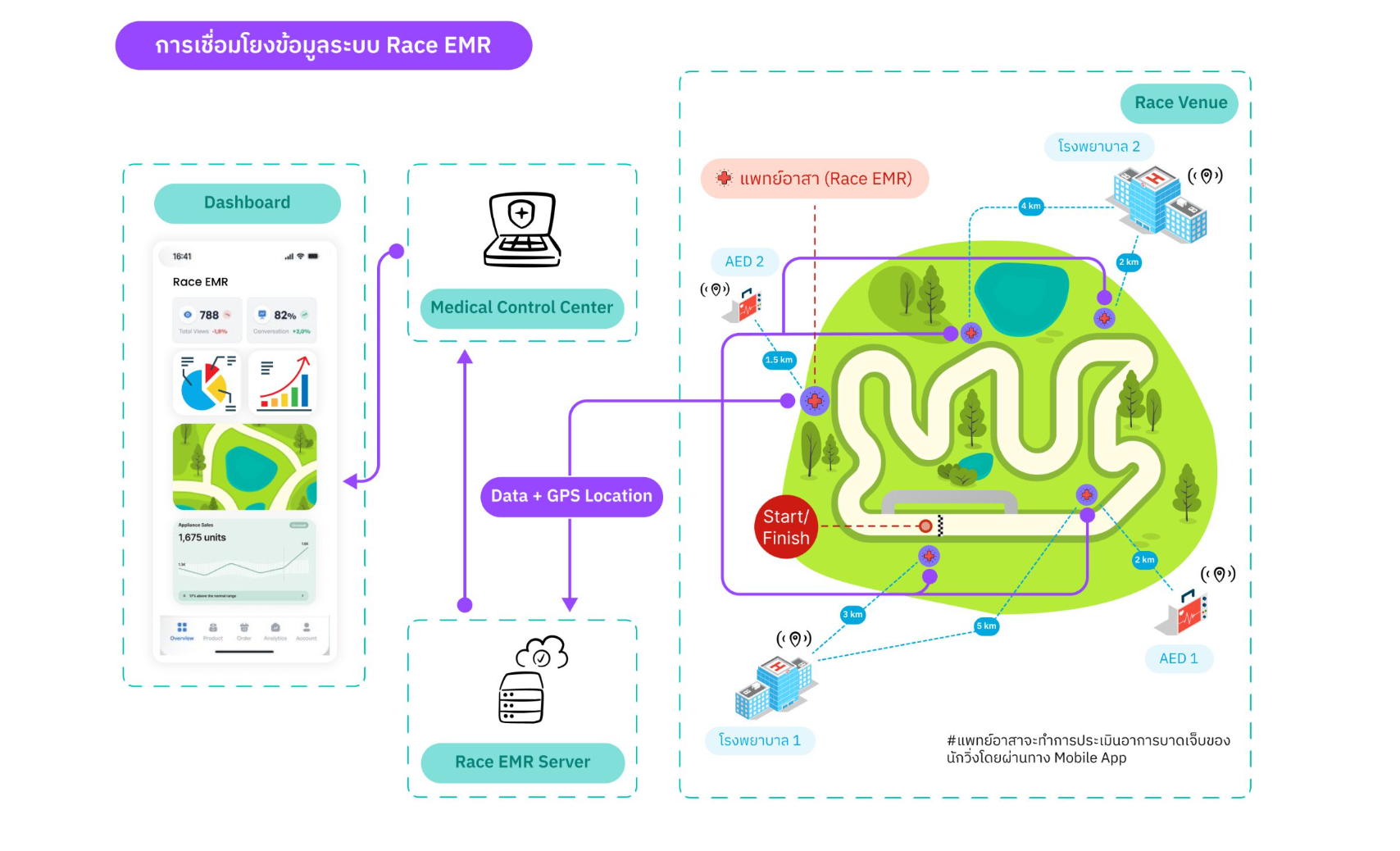 ระบบออนไลน์ที่ช่วยให้การดูแลเหตุการณ์ทางการแพทย์ในสนามได้มีประสิทธิภาพ แม่นยำ และรวดเร็วยิ่งขึ้น ระบบมี web app บนมือถือ สำหรับอาสาสมัครทางการแพทย์ทุกคน / แพทย์อาสาเข้าถึงข้อมูลนักวิ่งเพื่อการแพทย์ได้อย่างรวดเร็วจากทุกจุดทั่วสนามวิ่ง